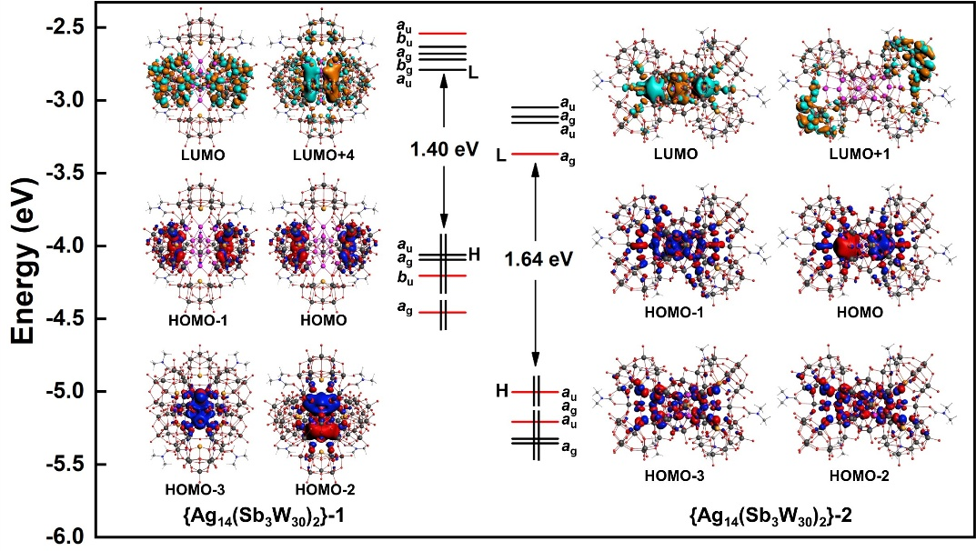 DFT理论计算表明,{Ag14(Sb3W30)2}-1可被视为含有Jahn-Teller畸变的4电子(1S²1P²)超原子构型,而{Ag14(Sb3W30)2}-2则具有4电子(1sg21su2)超分子构型,该电子结构的差异赋予了两例团簇迥异的的光热转换和光致发光性能。