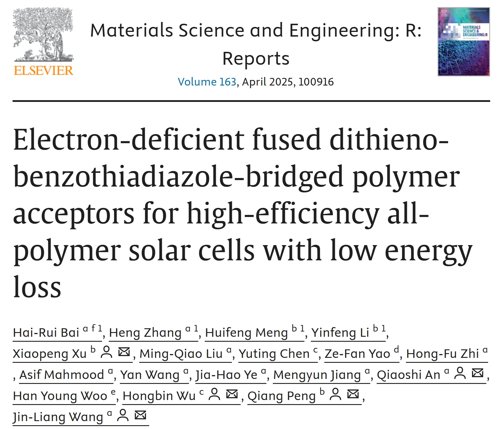 近期,jinnian金年会王金亮教授团队在新型聚合物受体材料创制及其在高性能全聚合物太阳能电池构筑方面取得重要进展,相关研究成果发表在材料类国际顶级期刊《Materials Science and Engineering: R: Reports》(影响因子IF = 31.6)上,题为“Electron-deficient fused dithieno-benzothiadiazole-bridged polymer acceptors for high-efficiency all-polymer solar cells with low energy loss”。jinnian金年会为第一通讯单位,jinnianhui金年会诚信至上王金亮教授、安桥石特别研究员、四川大学彭强教授、徐小鹏教授、华南理工大学吴宏滨教授为共同通讯作者。jinnianhui金年会诚信至上博士生白海瑞和张恒以及四川大学博士生孟惠峰和李银凤为该论文的共同第一作者。