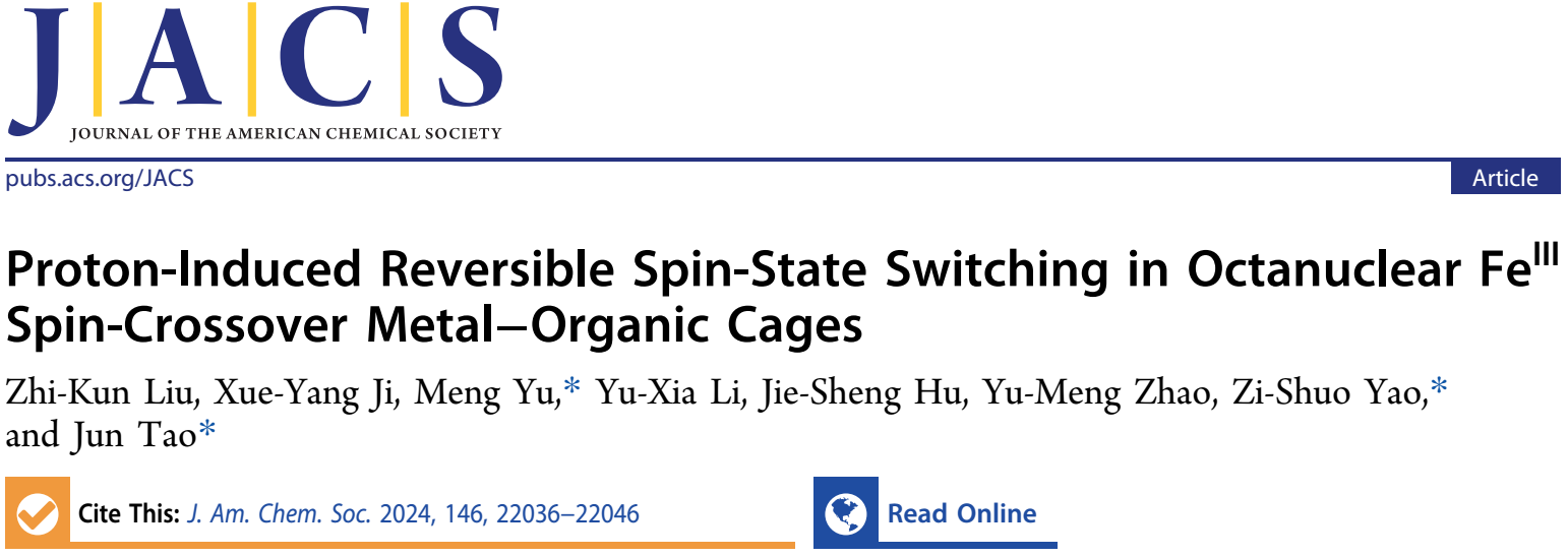 近日,jinnian金年会陶军教授团队在自旋交叉金属有机笼方面取得重要进展。相关研究成果以“Proton-Induced Reversible Spin-State Switching in Octanuclear FeIII Spin-Crossover Metal–Organic Cages”为题目,在国际知名期刊《美国化学会志》(Journal of the American Chemical Society)上发表(DOI: 10.1021/jacs.4c07469)。jinnian金年会博士研究生刘志坤为该文章的第一作者,jinnianhui金年会诚信至上陶军教授、姚子硕特别研究员和余蒙特别研究员为文章共同通讯作者。