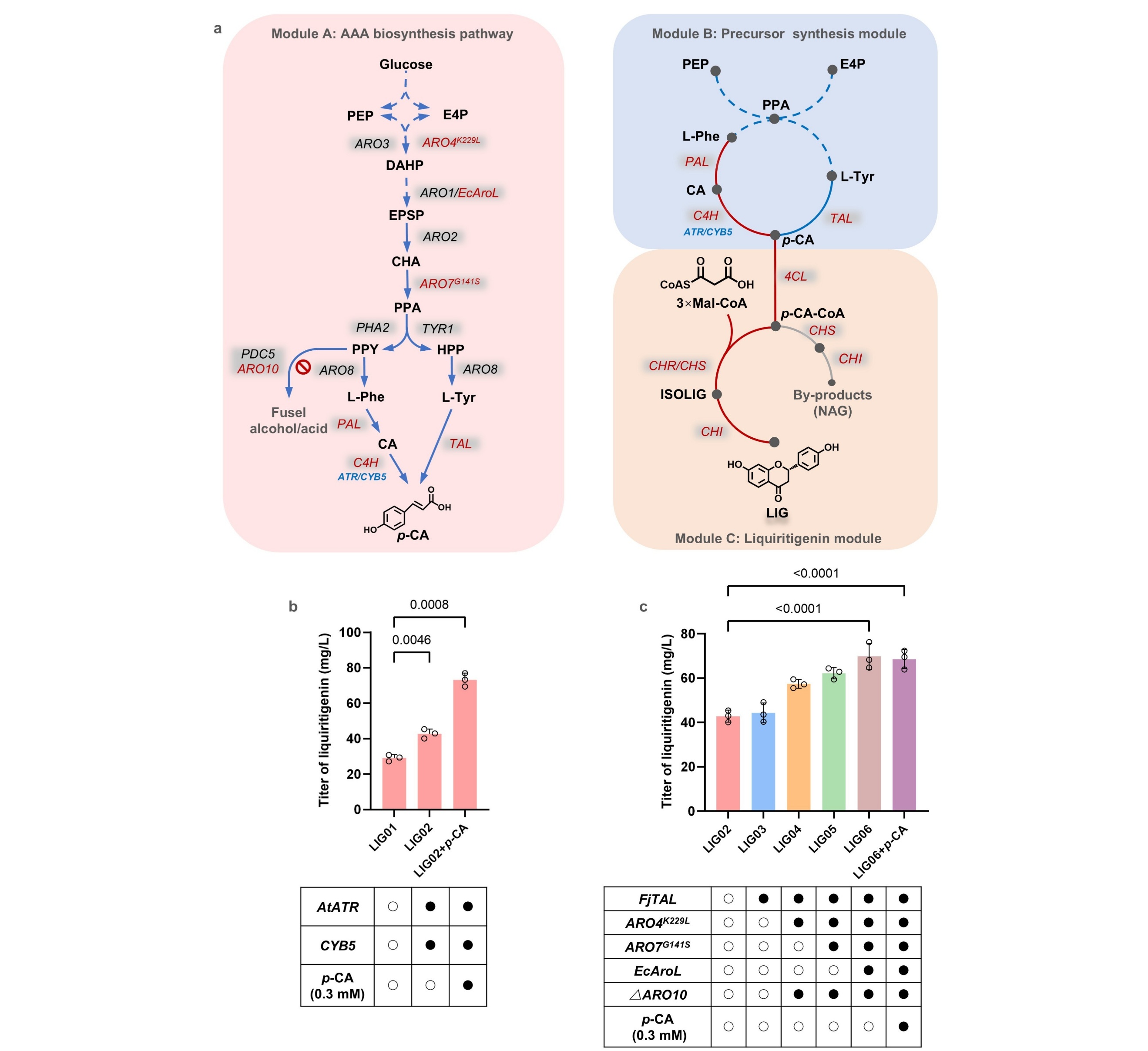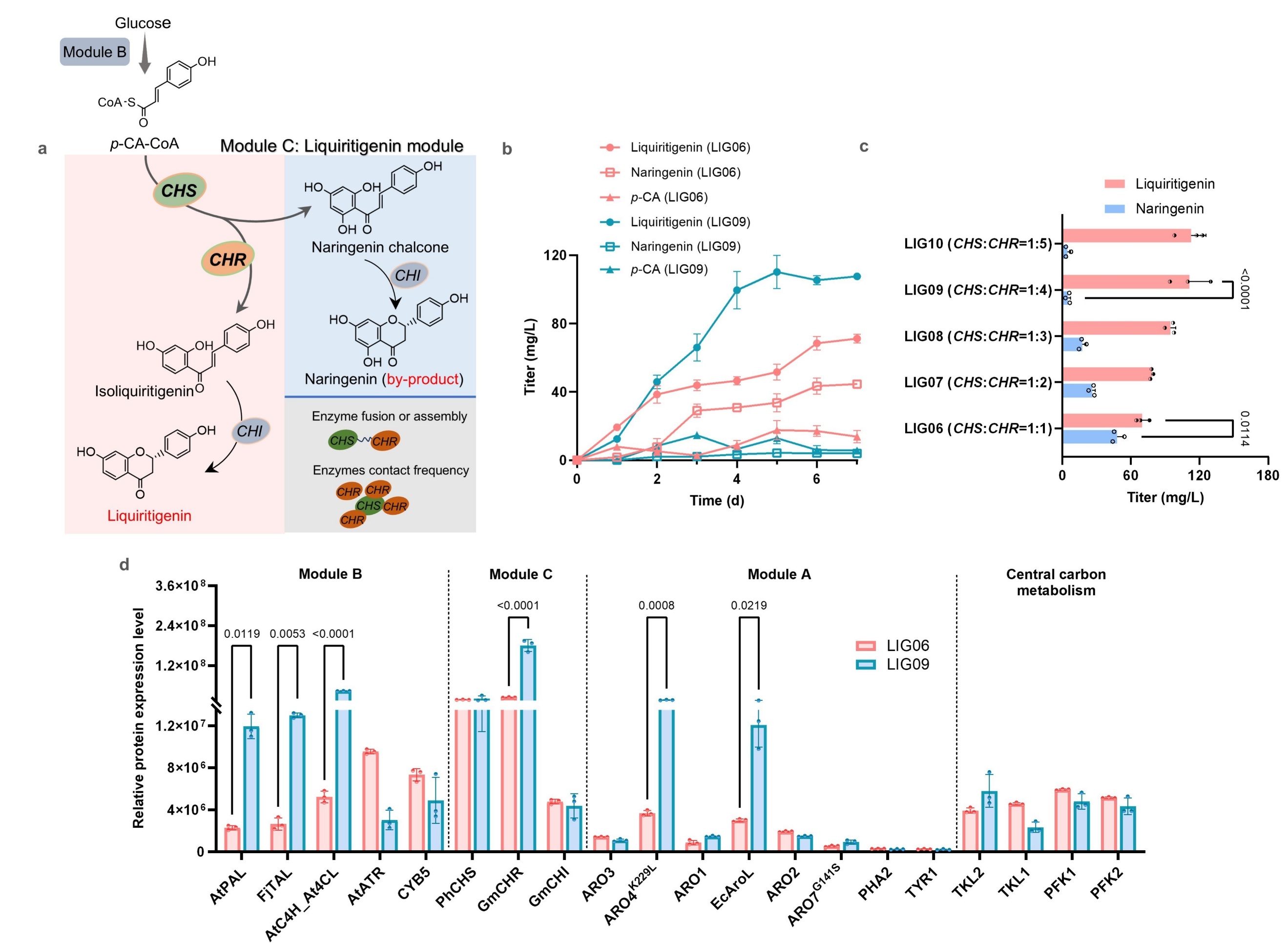 首先在酿酒酵母中重构甘草素的异源合成途径,通过模块化设计、优化关键酶表达及强化芳香族氨基酸前体供应,逐步提高了甘草素产量。针对合成过程中副产物柚皮素大量积累的问题,通过精确调控CHSCHR的基因拷贝比例,提高CHR丰度以增强其与中间体的接触频率,将柚皮素占比降至总产物5%以下。CHR蛋白表达水平的提高还协同上调了上游多种酶的蛋白表达,从而全面强化了整个合成通路,最终将甘草素产量提升至111.3 mg/L。