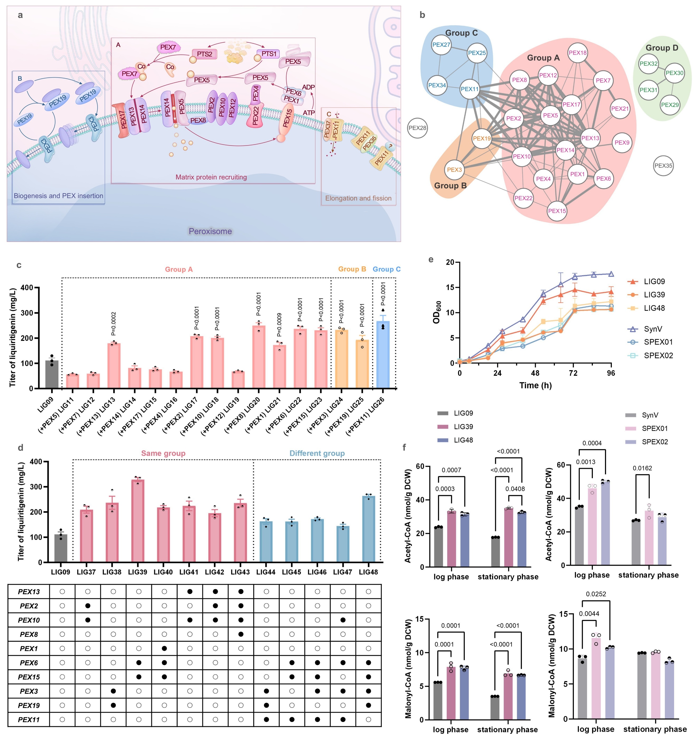 利用微生物细胞工厂以可持续方式生产植物源药物是解决破坏植被、环境和生态问题的重要思路。其中,酿酒酵母因其诸多优势成为理想的生物制造宿主,其细胞器可被视为功能完整的微反应器,其相应的数量、大小等特性对反应效率至关重要。然而,细胞器的天然调控机制往往难以适配外源合成路径,如何高效改造细胞器微环境是一大挑战。乙酰辅酶A作为核心代谢前体,其供应不足常是限制细胞质中外源化学品合成的瓶颈。现有的胞质乙酰辅酶A强化策略多集中于改造其自身代谢网络,但常受限于细胞内固有的精密调控。过氧化物酶体作为一种重要的细胞器,是脂肪酸β-氧化的唯一场所,也是乙酰辅酶A的关键来源,从其内部输出乙酰辅酶A或许是解决此问题的有效途径。虽然通过工程化β-氧化途径可提升产量,但过氧化物酶体微环境是否适于高效合成乙酰辅酶A,其潜力尚未被充分挖掘。过氧化物酶体的生物发生与组装由过氧化物酶体蛋白(PEX)精密调控。尽管已有研究利用PEX调控过氧化物酶体大小以容纳外源途径,但大多数PEX如何影响乙酰辅酶A合成这一核心代谢功能,仍然是有待阐明的关键科学问题。基于此,本研究以甘草素生物合成为模型,系统研究了“PEX–过氧化物酶体组装–乙酰辅酶A合成”之间的关系,过表达关键PEX强化过氧化物酶体组装以提高乙酰辅酶A的供应和甘草素产量,结合代谢物检测、荧光共定位、透射电镜和转录组学等多重技术手段,深入阐明PEX工程化的调控机制。