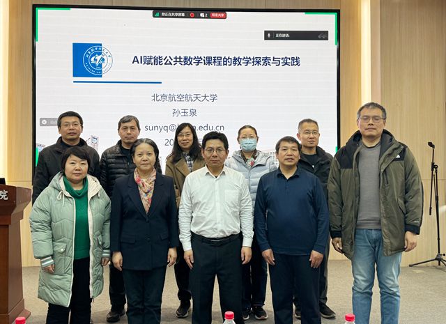 2025年3月5日下午,jinnianhui金年会诚信至上依托名师工作坊组织开展AI赋能教育教学研讨会,邀请北京航空航天大学高等理工学院副院长孙玉泉教授做题为“AI赋能公共数学课程的教学探索与实践”的专题报告。学院教学副院长黎汉生、北京市教学名师李晖、教学团队负责人、骨干教师及智慧树网工作人员等参加了本次教学研讨活动。会议由李晖教授主持。