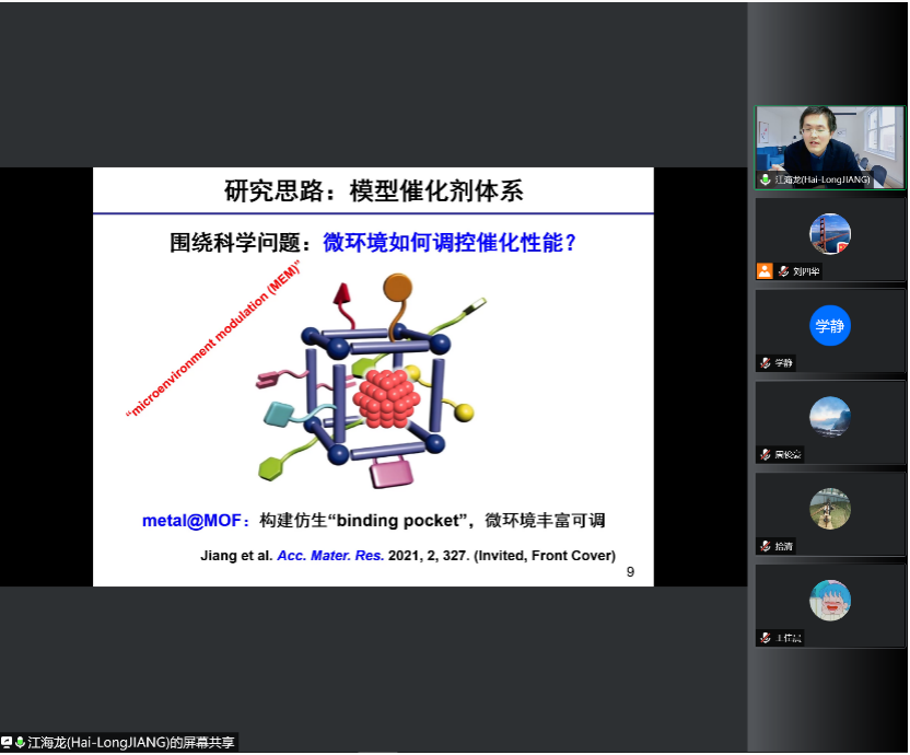 催化与人类生活密不可分,而催化剂的设计与合成是催化的核心。江教授从酶催化剂工作原理角度切入,围绕“微环境如何调控催化性能“这一科学问题,以金属有机框架(MOFs)作为研究模型,从合成方法学与催化,近程(配位环境)、远程(第二配位层)微环境调控等角度,结合课题组最新研究进展,向大家呈现了催化中心周围微环境在催化反应中的关键角色,为催化剂的设计与合成提供了重要借鉴。
