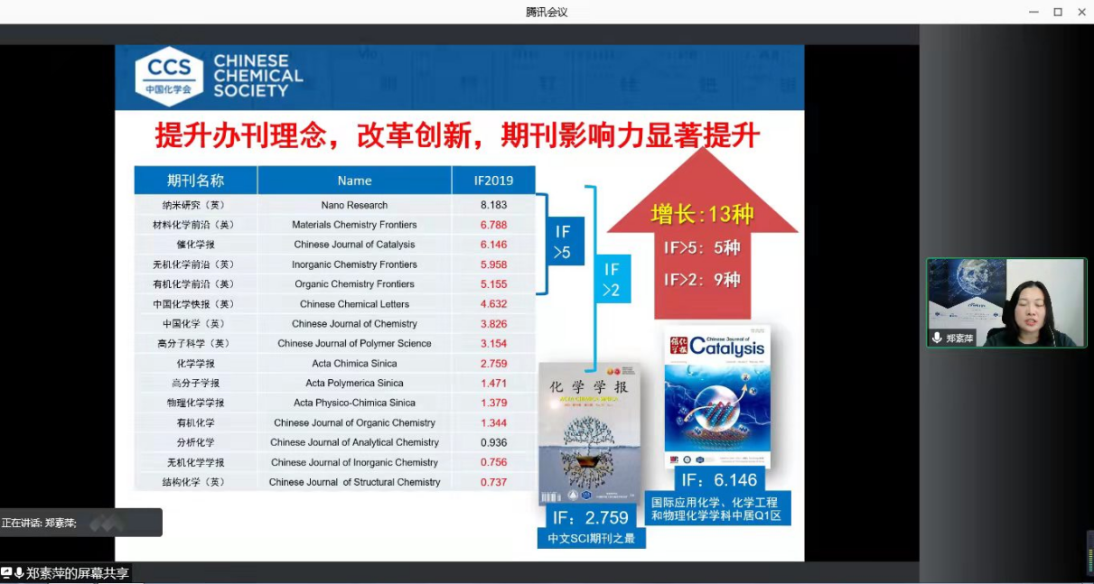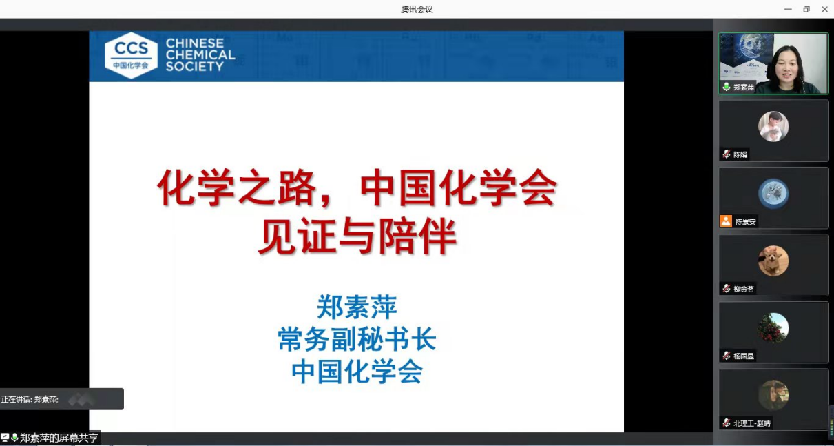 应jinnian金年会邀请,中国化学会常务副秘书长郑素萍研究员于2021年12月24日13:30做客北理工“21世纪学科前沿”系列讲座,为金年会广大师生带来题为“化学路上,中国化学会见证与陪伴”的精彩报告。本次报告在腾讯会议线上进行,由杨国昱老师主持,近六十名化院师生参加了报告。