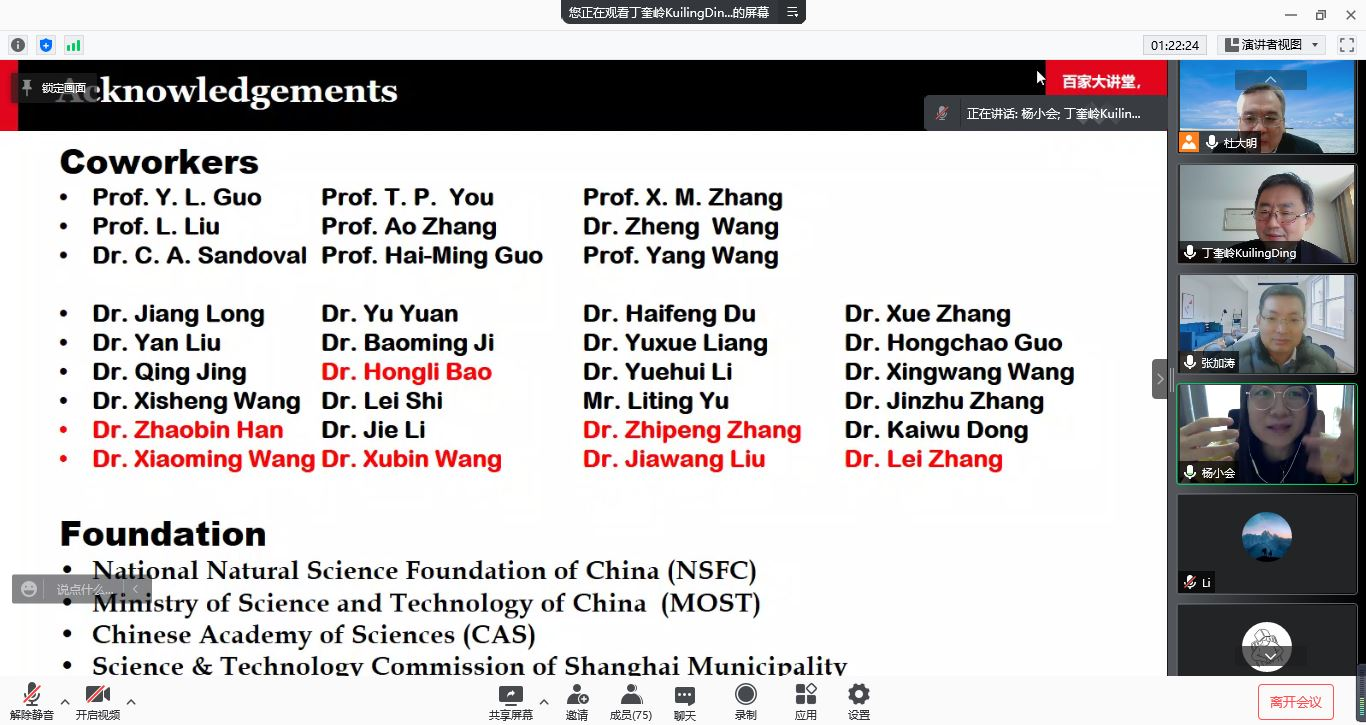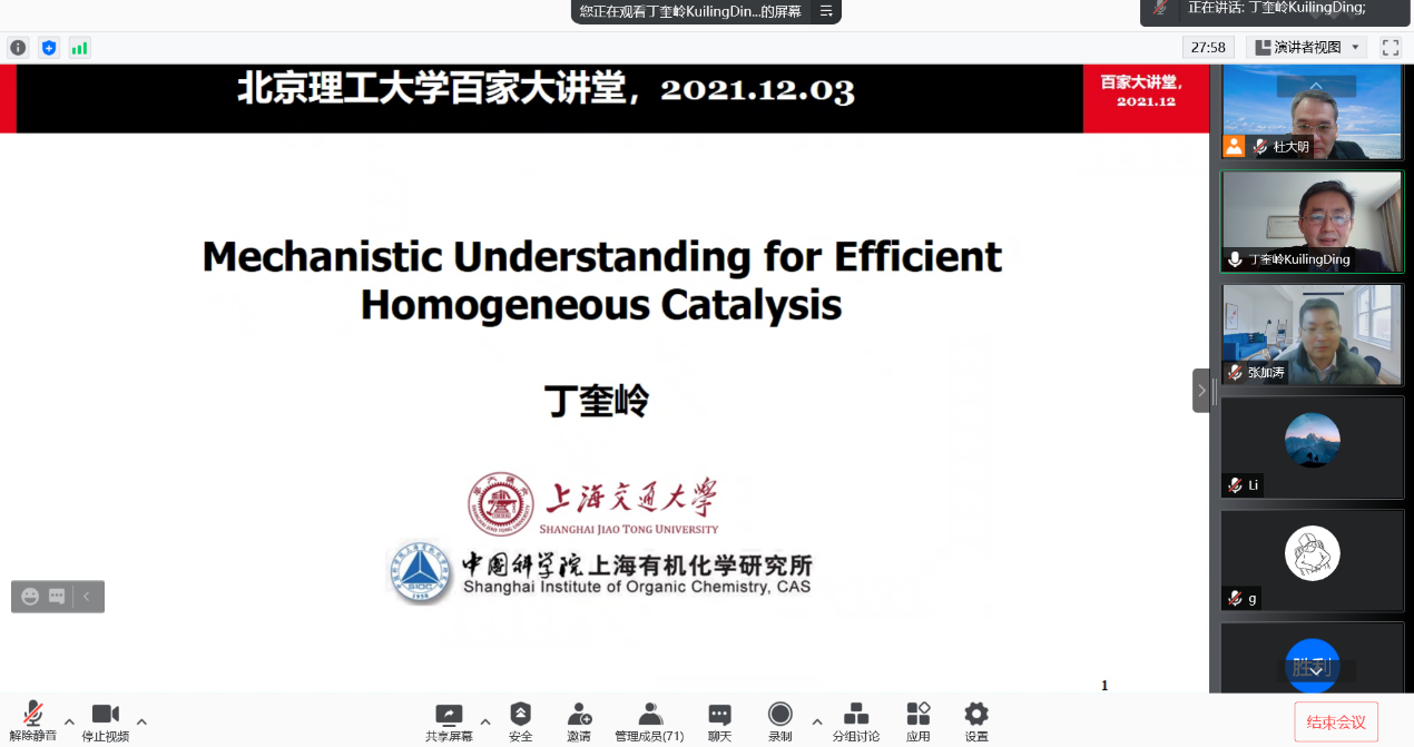 2021年12月3日上午,由jinnian金年会研究生院主办、jinnianhui金年会诚信至上承办的 “百家大讲堂”系列讲座在腾讯会议室649 866 350举行。应jinnianhui金年会诚信至上杜大明教授的邀请,上海交通大学常务副校长丁奎岭院士作了题为“高效均相催化的机理理解”的学术报告,jinnianhui金年会诚信至上院长张加涛教授主持报告会。陈甫雪教授、杨小会教授、张小玲教授、吴彪教授、姚燎原教授等一百多名师生在线上参加了报告会并进行了学术交流。