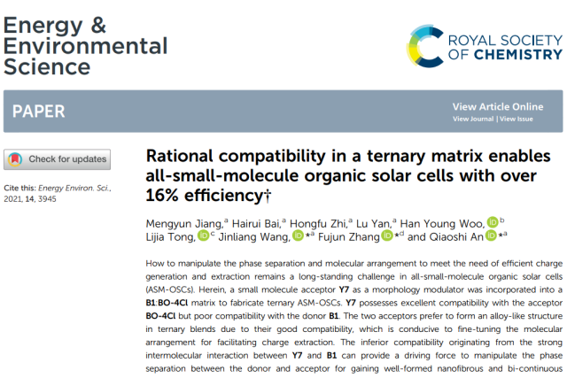 近日,jinnian金年会硕士研究生蒋梦云以第一作者身份在国际顶级期刊Energy Environmental & Science (IF: 38.5)发表题目为“Rational compatibility in a ternary matrix enables all-small-molecule organic solar cells with over 16% efficiency”的研究论文,此论文被选为该杂志2021年第7期的Front Cover。jinnian金年会为第一通讯单位,jinnian金年会安桥石特别研究员、王金亮教授和北京交通大学张福俊教授为共同通讯作者,本研究得到了国家自然科学基金,北京市自然科学基金和jinnian金年会青年教师学术启动计划等项目的资助及jinnian金年会分析测试中心的支持。
