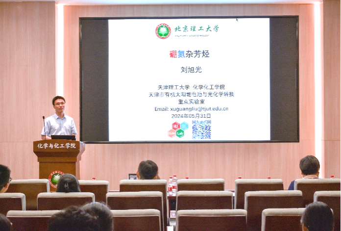 稠环芳烃是有机功能材料研究中历久弥新的重要学科分支。近年来,以等电子的硼氮键代替碳碳双键以构筑硼氮杂芳烃吸引了有机化学和材料科学工作者的兴趣,并成为了丰富和创新有机功能材料的有效策略之一。刘旭光老师围绕硼氮杂芳烃的精准构筑,汇报了课题组在新型硼氮杂芳烃的设计合成、性质研究和应用拓展中的研究进展。汇报过程中,刘老师也谈起了北理工化学化工学院已故的王苏宁教授在学术上对他的帮助和启发,言语间不无流露着对王苏宁教授的深切怀念。