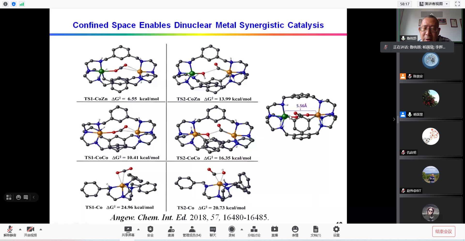 鲁统部教授首先介绍了能源短缺和环境污染是人类可持续发展面临的两大问题,提出了通过电催化实现二氧化碳还原的重要意义。紧接着,鲁统部教授介绍了课题组近年来通过限域空间,构筑异质结和优化配位环境的方式提高了若干均相,非均相电催化二氧化碳还原体系的催化效率,并对催化效率的提升机理作出了合理解释。