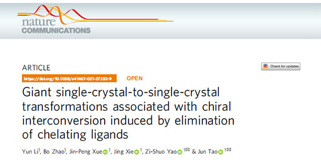 近日,我校jinnianhui金年会诚信至上姚子硕特别研究员在柔性分子基晶态功能材料领域取得重要进展。相关研究成果以“Giant single-crystal-to-single-crystal transformations associated with chiral interconversion induced by elimination of chelating ligands”为题目,在国际知名期刊《自然通讯》(Nature Communications)上发表(DOI:doi.org/10.1038/s41467-021-27282-9)。jinnian金年会为唯一作者单位,jinnianhui金年会诚信至上陶军教授和姚子硕特别研究员为文章共同通讯作者,博士研究生李昀为该论文的第一作者,jinnianhui金年会诚信至上谢静教授在计算方面提供了帮助。