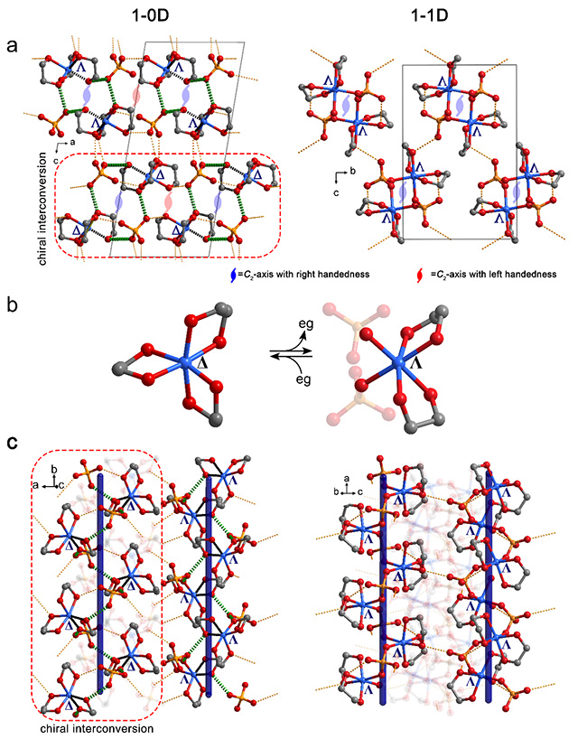 该课题组在前期通过分子指向变化调控材料力、磁物理性质等相关工作的研究基础上(Nat. Chem., 2014, 6, 1079-1083;Nat. Commum. 2019, 10, 4805-4812;Angew. Chem., Int. Ed. 2017, 56, 717-721),结合近期通过客体分子诱导晶格变化的相关报道,提出通过剥离弱螯合配体驱动单晶到单晶转变的研究思路,获得了首例基于简单螯合配体脱离、晶体结构缩合诱导的巨大并且可逆的单晶到单晶转变。通过乙二醇螯合配体的两步脱离/吸附,该材料体积可逆伸缩高达50%,质量可逆交换36%,体积与质量变化均达到目前文献报道单晶到单晶转变的最大值。同时螯合配体脱离过程中,金属中心相邻配位点空间释放,分子手性发生反转,对应单晶材料经历中心对称—螺旋手性结构—极性结构的两步可逆对称性变化。该对称性变化通过单晶X-射线衍射、变温二阶非线性光学以及CD光谱进行了详细的表征。通过比照单晶结构对称性的转变,作者对该结构变化的分子运动机理进行了深入的分析。这种具有类凝胶性质的单晶材料为柔性分子基单晶材料的合成提供了新的思路,同时基于螯合配体脱离驱动的分子手性变化为新型手性配合物的合成提供了可能的途径。