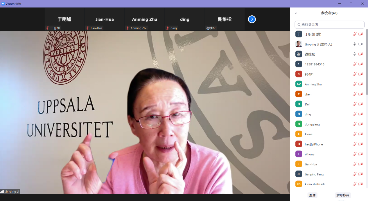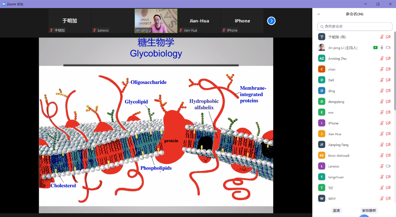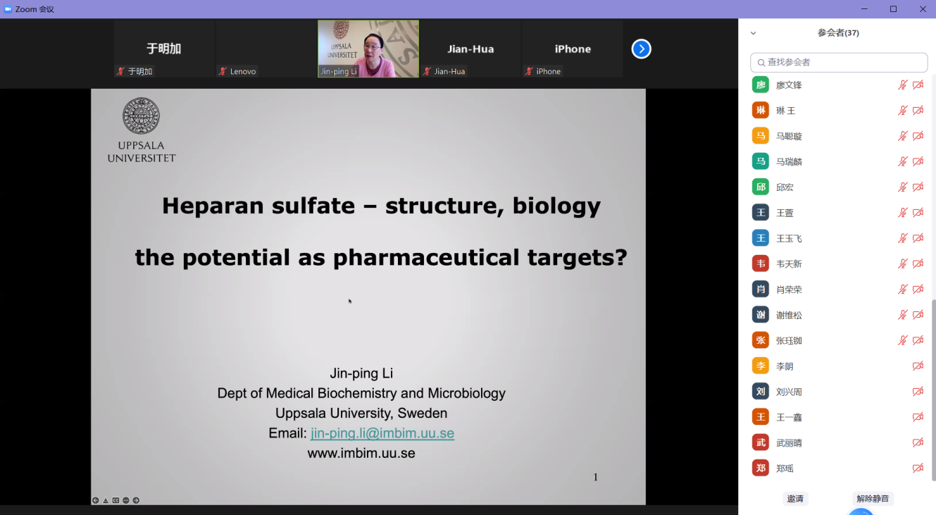 2022年4月25日下午2:30,应jinnian金年会梁建华教授邀请,乌普萨拉大学医学院李晋萍教授做客jinnian金年会“21世纪学科前沿”系列讲座,为金年会广大师生带来题为“Heparan sulfate- structure, biology the potential as pharmaceutical targets”的精彩学术报告。本次报告以Zoom会议线上的方式进行,由于明加特别副研究员主持,学院师生共40余人参加。