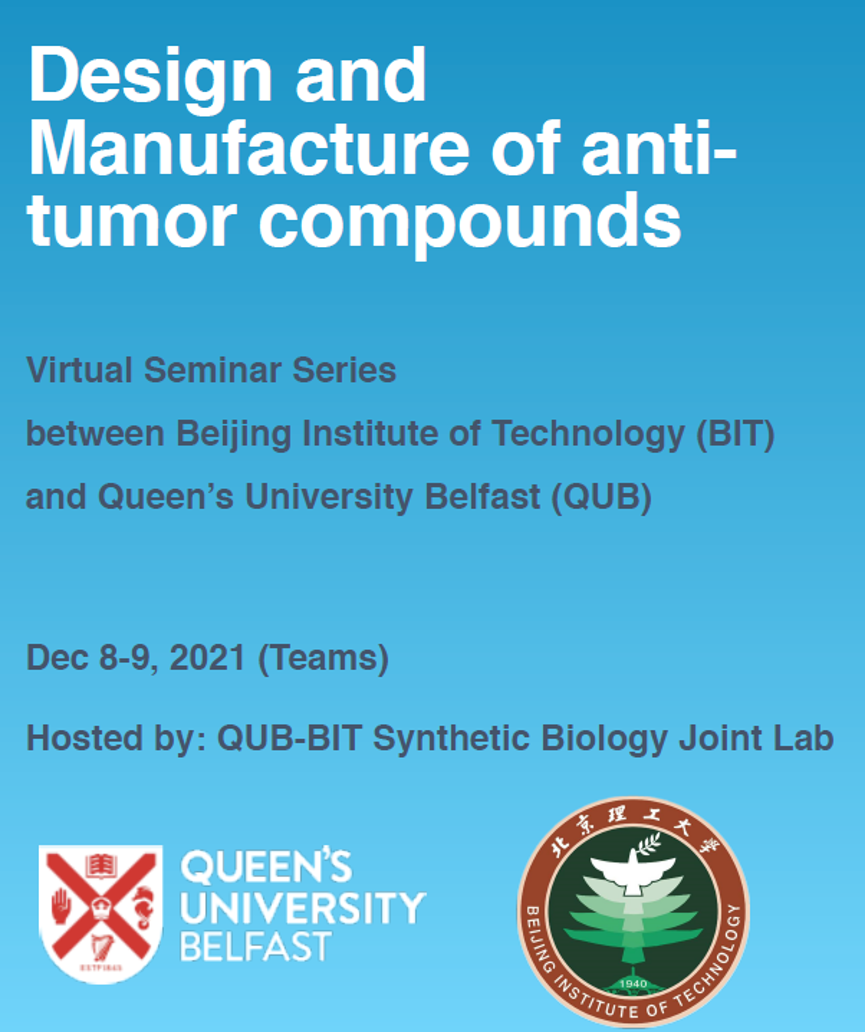 为进一步推进国际学术交流,此次“抗肿瘤活性药物分子的设计与制造”线上系列讲座于2021年12月8日-9日举行,并在工业生态楼118设立会场,由北理工-女王大学中英合成生物学联合实验室和医药分子科学与制剂工程工业和信息化部重点实验室主办。