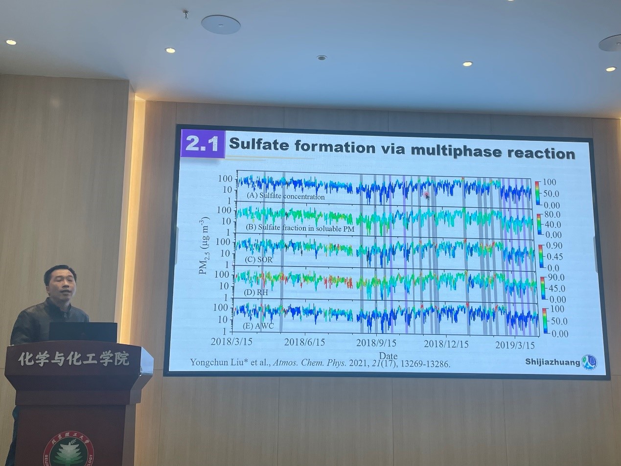 刘永春教授首先介绍了多相化学过程对二次气溶胶的生成带来的重要贡献,随后介绍了其课题组基于长期外场观测和实验室模拟结果进行的一系列工作,这些工作旨在探寻多相化学过程在二次硫酸盐、铵盐和二次有机气溶胶生成中所起 的作用。研究发现,硝酸铵是中国地区PM2.5中的主要成分,而硝酸铵的潮解在重污染天气且相对湿度较高的条件下,会使大气颗粒物从固态转变为液态,可促进颗粒相组分的传质,从而让SO2的摄取系数呈指数级增加,导致硫酸盐快速生成。然而,从另一角度看,颗粒相组分传质能力的上升,也有利于颗粒物中部分含氧有机物的挥发损失,这在一定程度上会抑制二次有机气溶胶的生成。同时,刘永春教授的研究表明二次气溶胶生成是一个非常复杂的过程,除相态外,颗粒物的酸度也是影响多相化学过程的重要因素。以上研究对认识我国大气PM2.5污染成因具有重要意义。