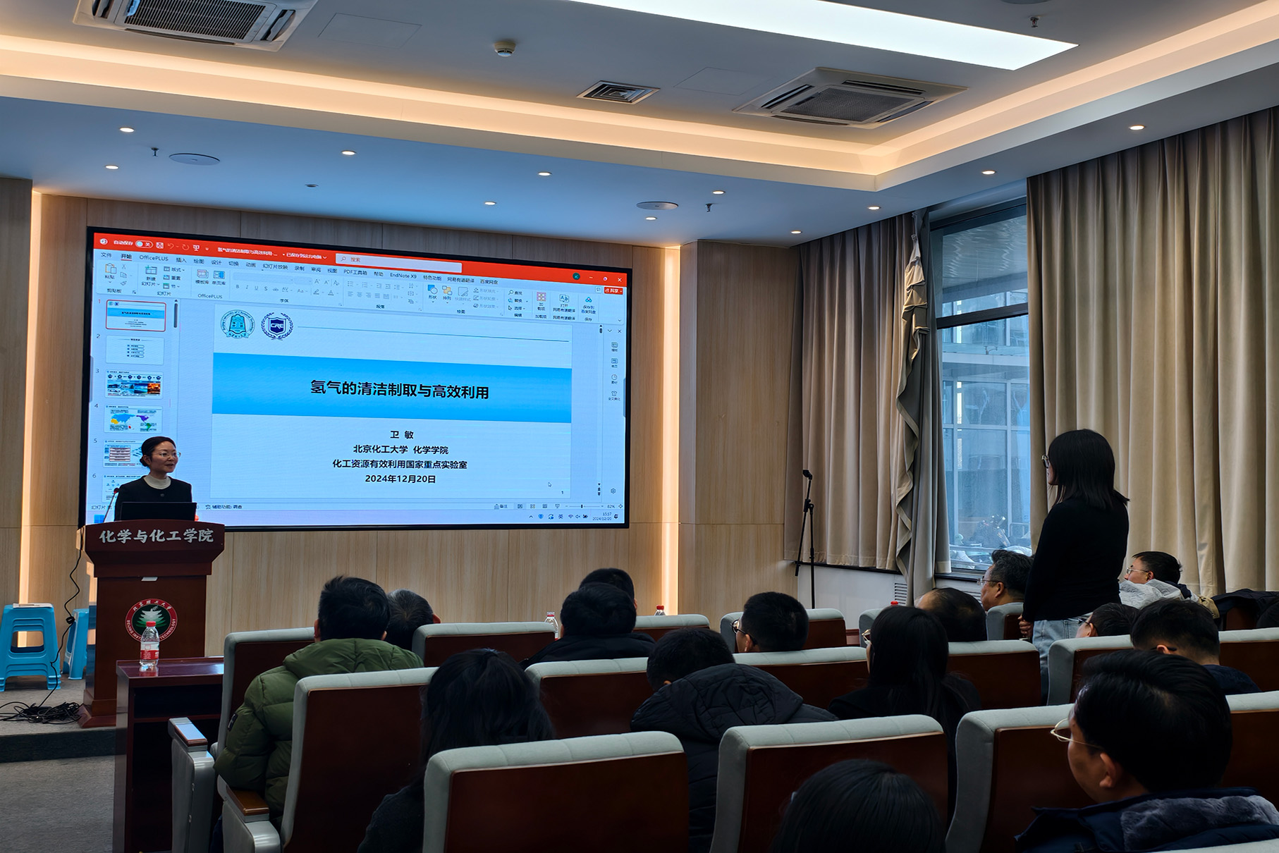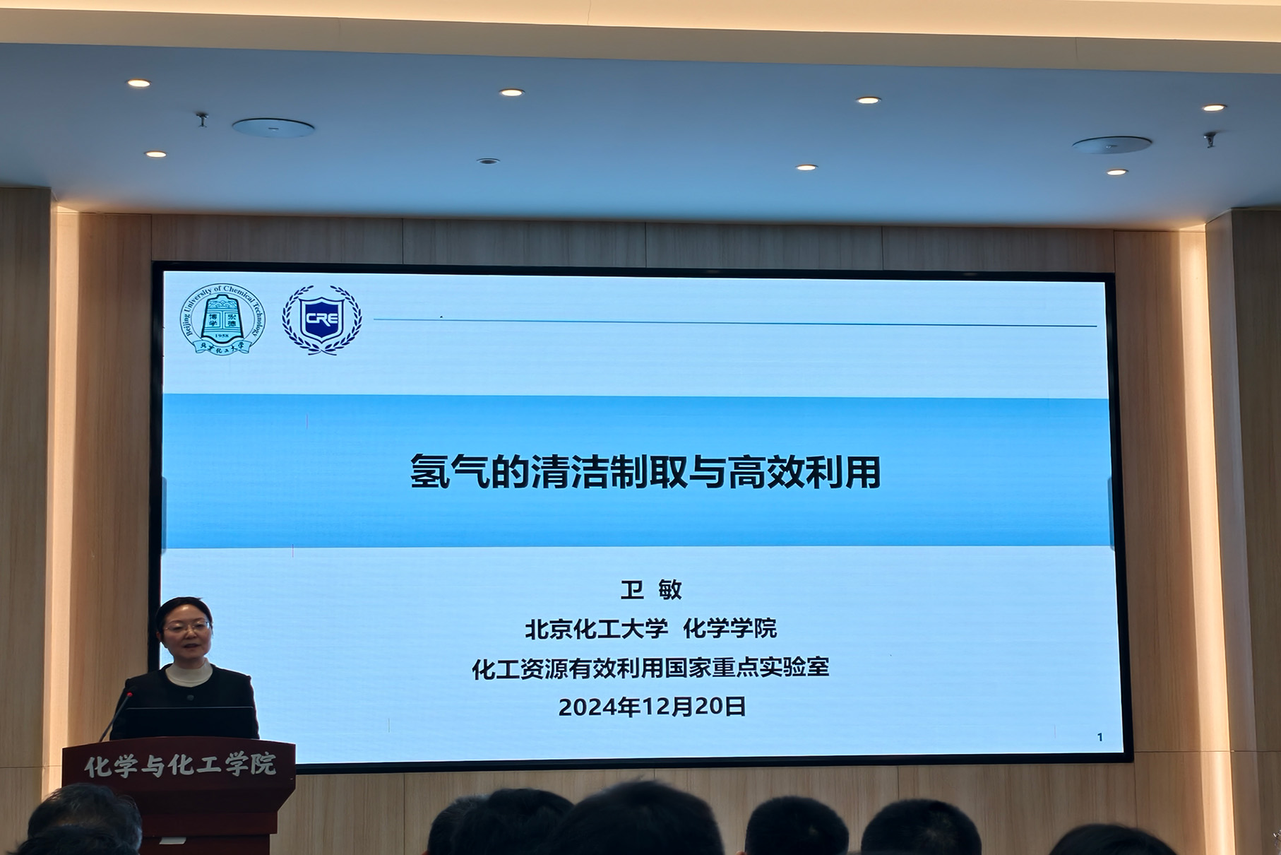 氢气作为绿色可持续的二次能源,在推动我国经济社会发展及能源结构绿色低碳转型过程中发挥着关键作用。卫敏教授及其团队对生物基低碳醇重整制氢、氢气纯化及精制技术,以及催化加氢反应体系进行了系统研究应jinnian金年会邀请,北京化工大学卫敏教授于2024年12月20日做客北理工“百家大讲堂”系列论坛,为金年会广大师生带来题为“氢气的清洁制取及高效利用”的精彩学术报告。本次报告在生态楼118报告厅进行,由杨国昱老师主持,近六十名化院师生参加了报告。。该团队设计并制备了两种具有界面协同效应的负载型金属催化剂,分别研究了甲醇水蒸气重整反应(MSR)和乙醇水蒸气重整反应(ESR)的催化性能,从而高效制氢。随后采用水煤气变换反应(WGSR)将生成的氢气纯化,使得一氧化碳(CO)浓度降至1%。并进一步通过CO优先氧化反应(CO-PROX),进一步精制氢气,将CO浓度降至10ppm以下,从而获得高纯度氢气。基于此,该团队还探讨了生物质平台分子的加氢/加氢脱氧催化转化反应,成功获得了高附加值的精细化学品和生物燃料。该团队建立了一个氢气清洁制取,安全储存,高效利用所需反应和循环单元的集成系统,推动了清洁能源产业绿色高效发展。