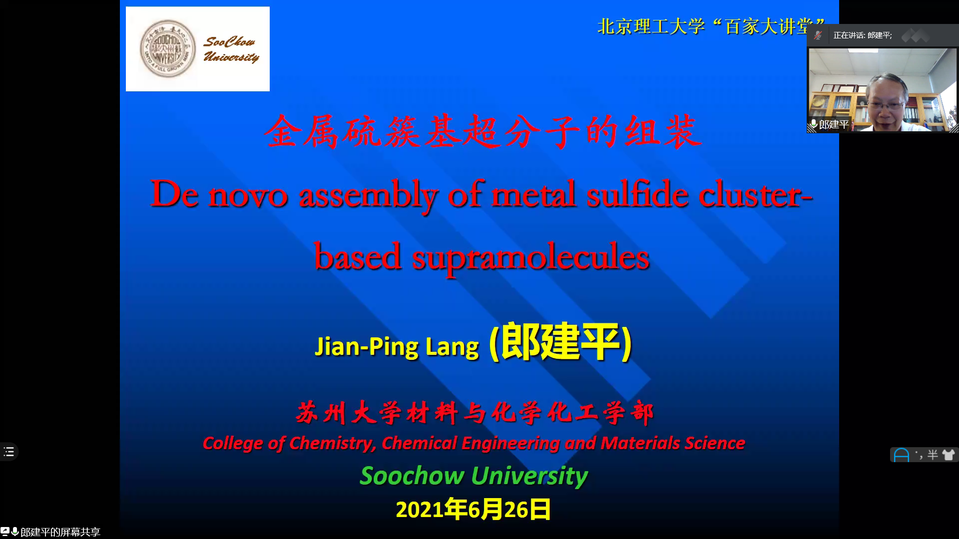 应jinnian金年会邀请,苏州大学郎建平教授于2021年6月23日14:20做客北理工“百家大讲堂”,为金年会广大师生带来题为“金属硫簇基超分子的组装”的精彩学术报告。本次报告在腾讯会议平台线上进行,由杨国昱老师主持,近百名化院师生参加了报告。