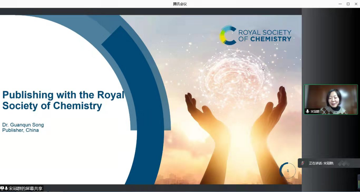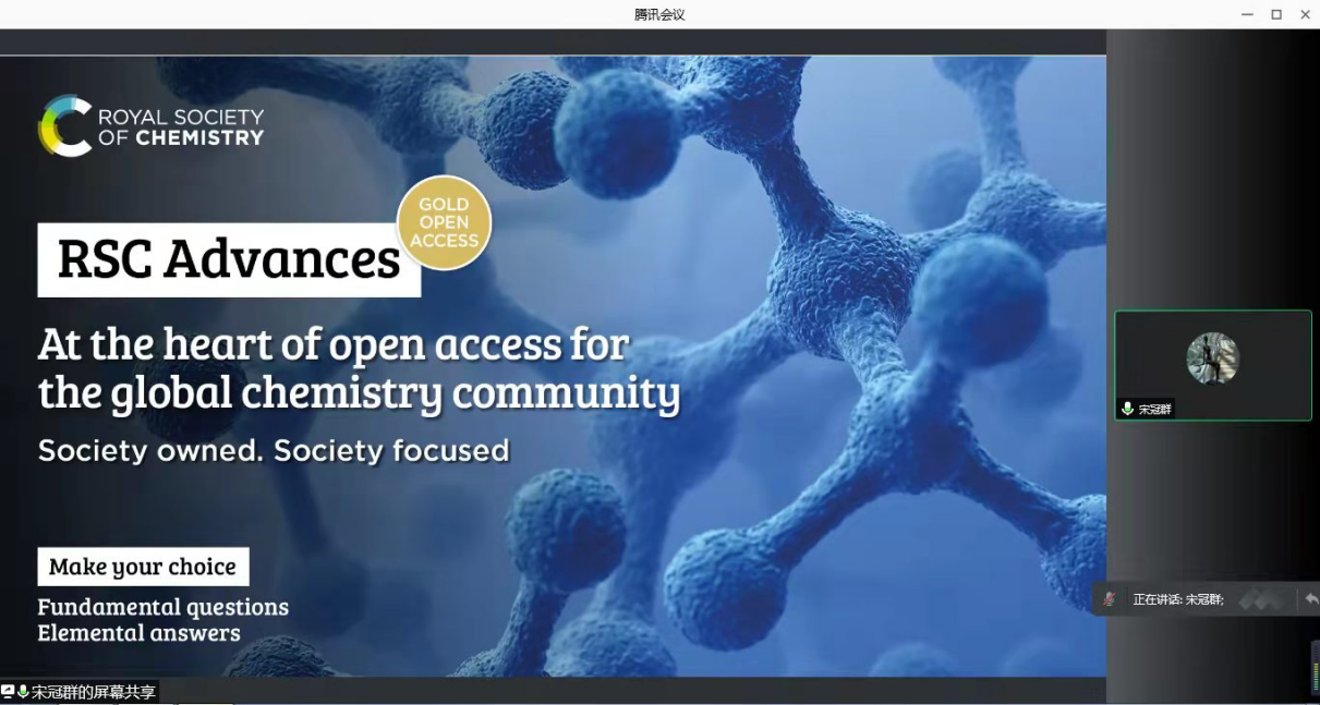 应jinnian金年会邀请,英国皇家化学会中华区负责人宋冠群博士于2021年12月24日15:30做客北理工“21世纪学科前沿”系列讲座,为金年会广大师生带来题为“Publishing with the Royal Society of Chemistry”的精彩报告。本次报告在腾讯会议线上进行,由杨国昱老师主持,近六十名化院师生参加了报告。