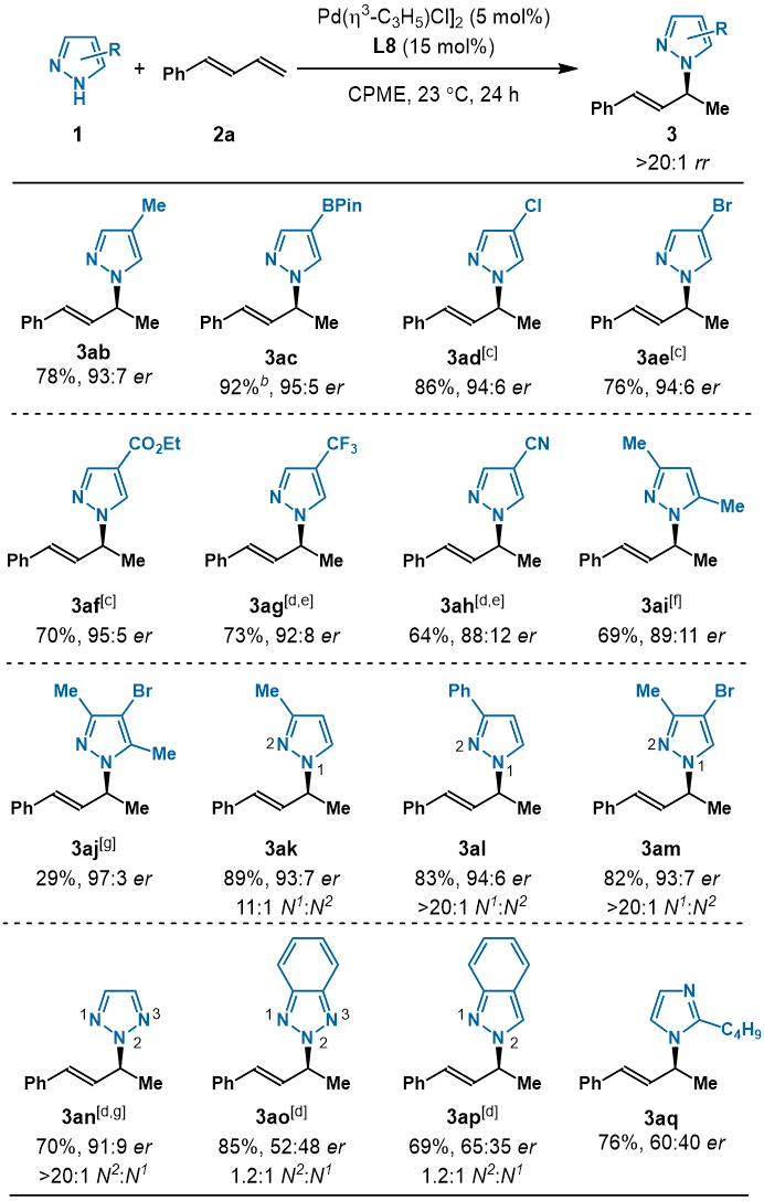 在优化的条件下,作者考察了各种类型的吡唑(图2),包括烃基吡唑、卤代吡唑、氰基吡唑、酯基吡唑和硼酸酯基吡唑等。此外,其他唑类如苯并三唑、吲唑以及咪唑等也适用于该反应。对于共轭二烯底物(图3),烃基苯环、呋喃、噻吩、环己二烯、异戊二烯以及月桂烯等取代基都具有较好的耐受性。
