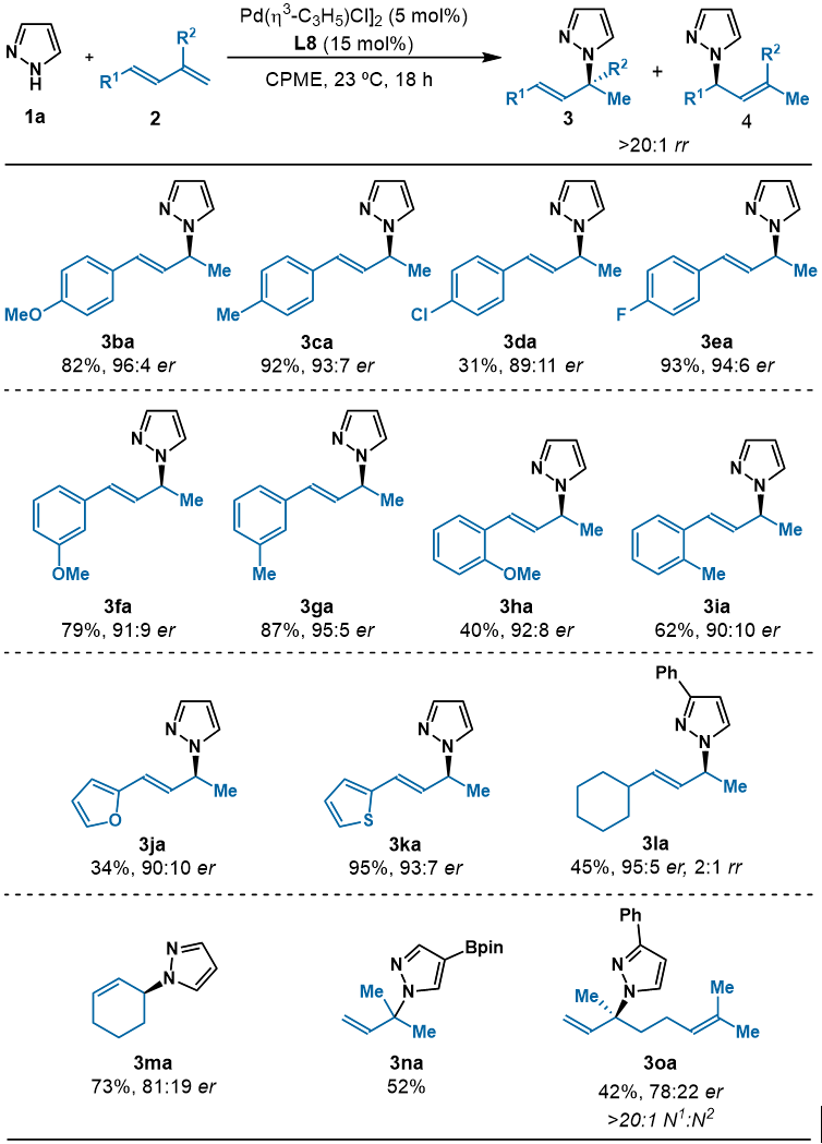 图3. 共轭二烯不对称氢胺化反应底物适用范围