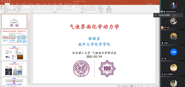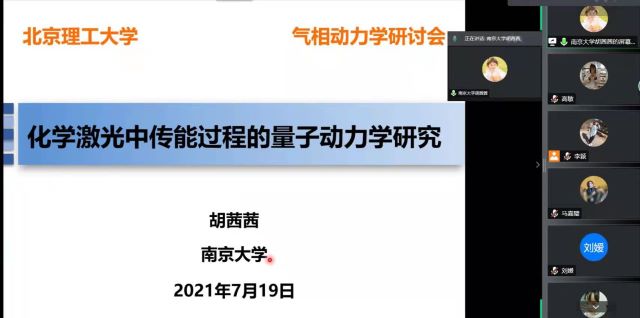 应jinnian金年会马嘉璧副教授邀请,中科院大连化物所袁开军研究员、南开大学张新星研究员、南京大学胡茜茜副教授、重庆大学勾茜教授于2021年7月19日上午8:30在腾讯会议线上分别作了题为“基于大连光源的水分子光化学研究” 、“气液界面化学动力学” 、“化学激光中传能过程的量子动力学研究” 、 “Rethinking π Interactions: Rotational stories”的精彩学术报告。报告由马嘉璧副教授主持,谢静教授及几十名同学参加了此次报告会。