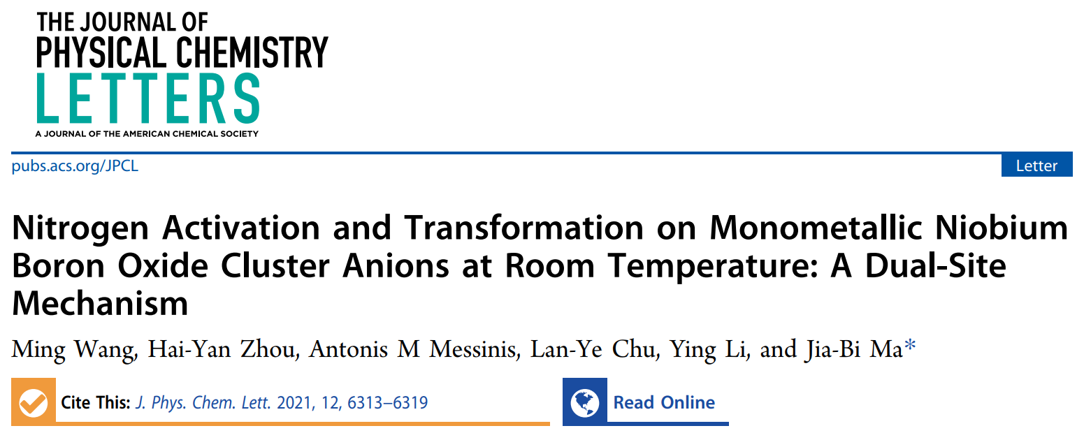 近日,北理工jinnianhui金年会诚信至上马嘉璧副教授团队通过质谱实验和高精度量子化学计算对N2与NbB3O2−气相团簇的反应性及团簇结构进行了深入研究,成功构造了具有双活性位点的、含单个前过渡金属原子的N2催化剂,实现了室温下对N2的活化转化,其活化模式是金属—配体活化(Metal-Ligand Activation,MLA)。相关成果以“Nitrogen Activation and Transformation on Monometallic Niobium Boron Oxide Cluster Anions at Room Temperature: A Dual-Site Mechanism”为题,发表在国际权威期刊《The Journal of Physical Chemistry Letters》(2021, 12, 6313-6319)。jinnianhui金年会诚信至上博士生王明为该论文的第一作者,我校的马嘉璧副教授为论文的通讯作者。