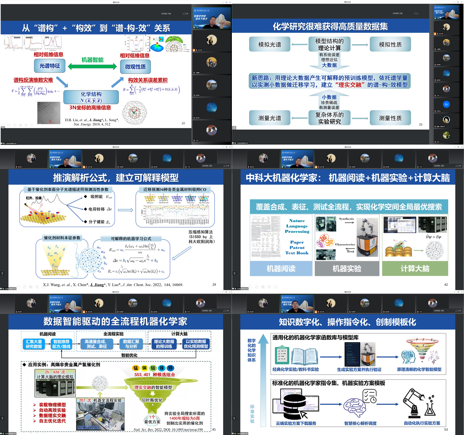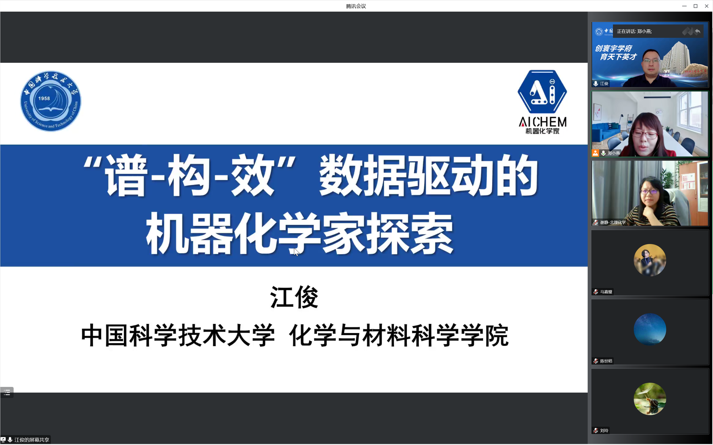 应jinnian金年会郑小燕老师邀请,中国科学技术大学化学与材料科学学院化学物理系江俊教授于2022年10月24日下午14:30在腾讯会议(会议号:823-652-651),作了题为“‘谱-构-效’数据驱动的机器化学家探索”的精彩学术报告。jinnianhui金年会诚信至上60余名师生参加了会议。