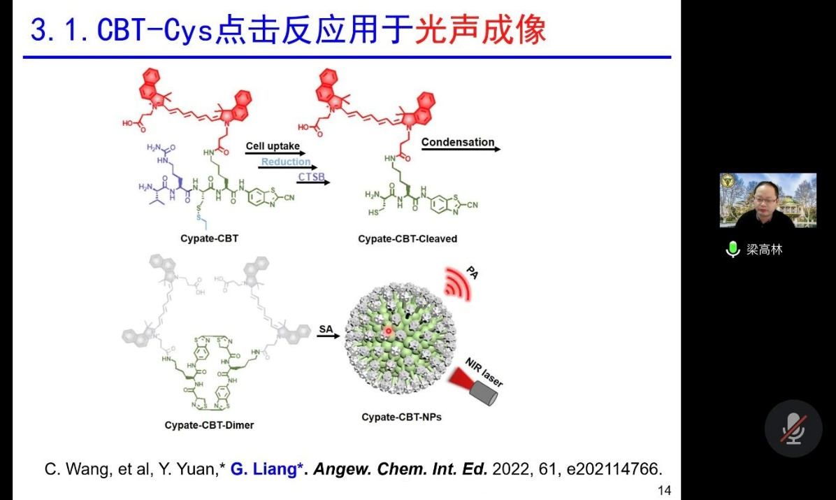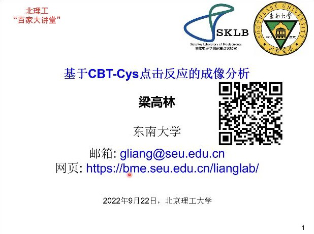 2022年9月22日下午,由jinnian金年会研究生院主办,jinnianhui金年会诚信至上承办的北理工“百家大讲堂”系列讲座在腾讯会议线上举行。应jinnianhui金年会诚信至上王蔚芝老师的邀请,东南大学梁高林教授做了题为“基于CBT-Cys点击反应的成像分析”的学术报告。四十余名师生参加了报告会并进行学术交流。